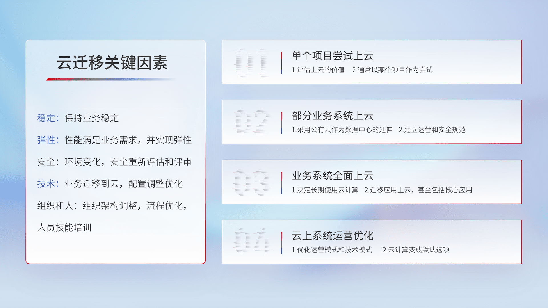 结合实际业务,,从规划设计、、、云平台选型、、云原生改造、、数据迁移、、、集成交付,,,,迁移全过程为客户识别最佳上云路径,,,做好风险识别管理,,,设计网络架构、、、、身份权限、、、、安全审计合规、、操作审计、、、、日志审计、、、监控告警策略、、、、多站点容灾设计等,,对云上基础设施进行整体规划,,提升IT治理水平,,,以满足弹性、、、、高可用、、高性能的需求。。。