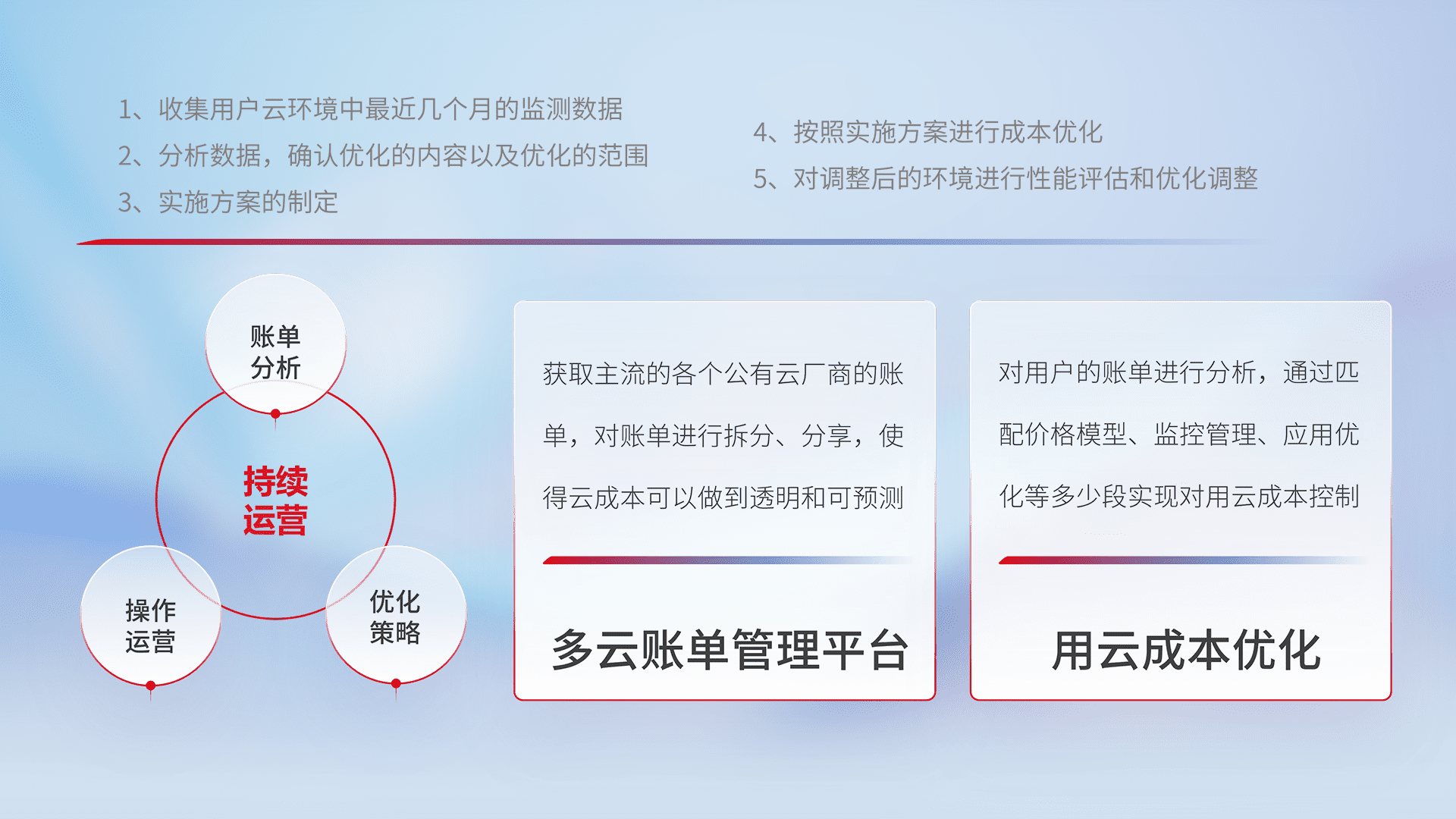 通过多云纳管,,以统一的资源数据模型把客户的云资源进行抽象和封装,,,进而实现对多云资源的统一操作,,,保障云资源管理的可靠性、、稳定性与可用性。。。。量身定制化运维内容,,,配置、、、、开发运维、、补丁管理、、备份、、监控、、认证和访问管理、、、、审计和日常巡检等,,保障在用云过程中的可靠度,,,,稳定度以及高可用率。。